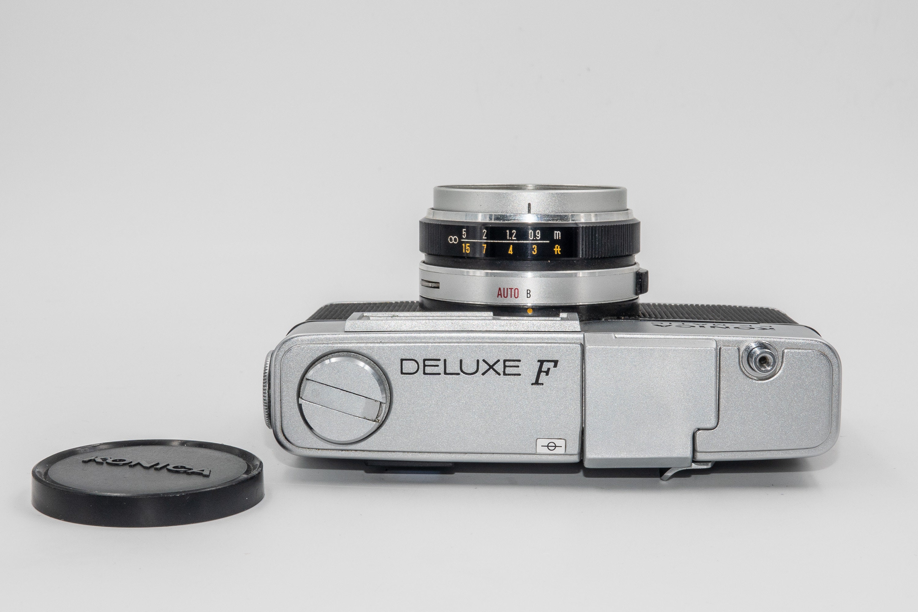 The Konica EE-Matic Deluxe F is a top of the EE-Matic line fully automatic rangefinder with a flashbulb socket on top, that automatically opens when switching from "A" to "B" mode. The viewfinder is large and bright, and has fixed framelines with parallax marks. There's no indication of speed or f-stop inside it, but a small reflected red icon depicting a hand lights up when low light might cause the camera shake to blur the picture.