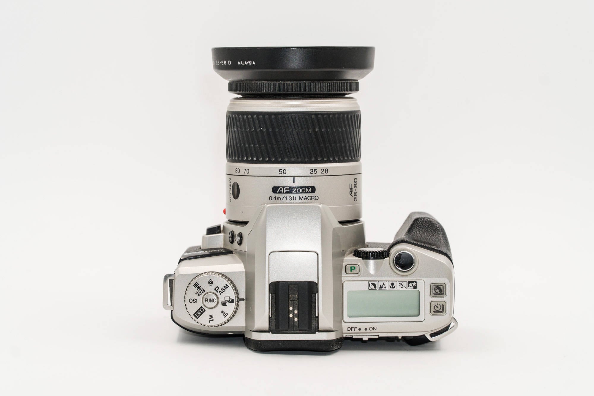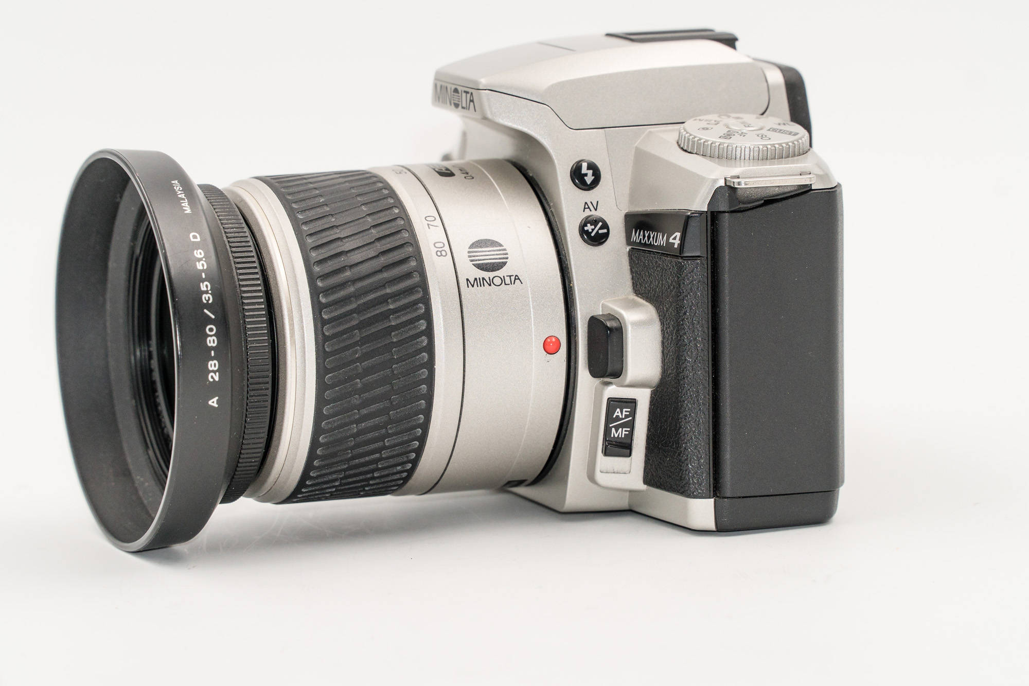 In addition to the essential modes P, A, S and M, the Maxxum 4 has all the usual quick-modes for the beginner: portrait, landscape, close-up, sports and night portrait. As with comparable film cameras of the period, the Maxxum 4 has multiple-frame drive mode, and self-timer; the maximum speed for continuous shooting is just short of two frames per second. Also, like other similar cameras, the Maxxum 4 has a built-in pop-up flash as well as a shoe for a dedicated flash with TTL flash control.