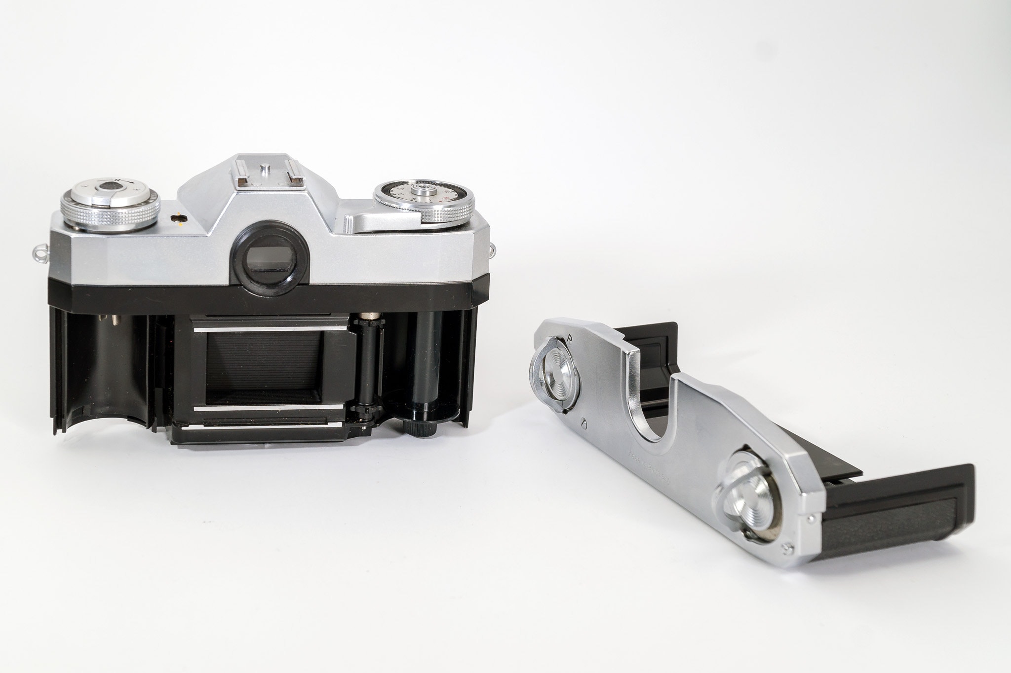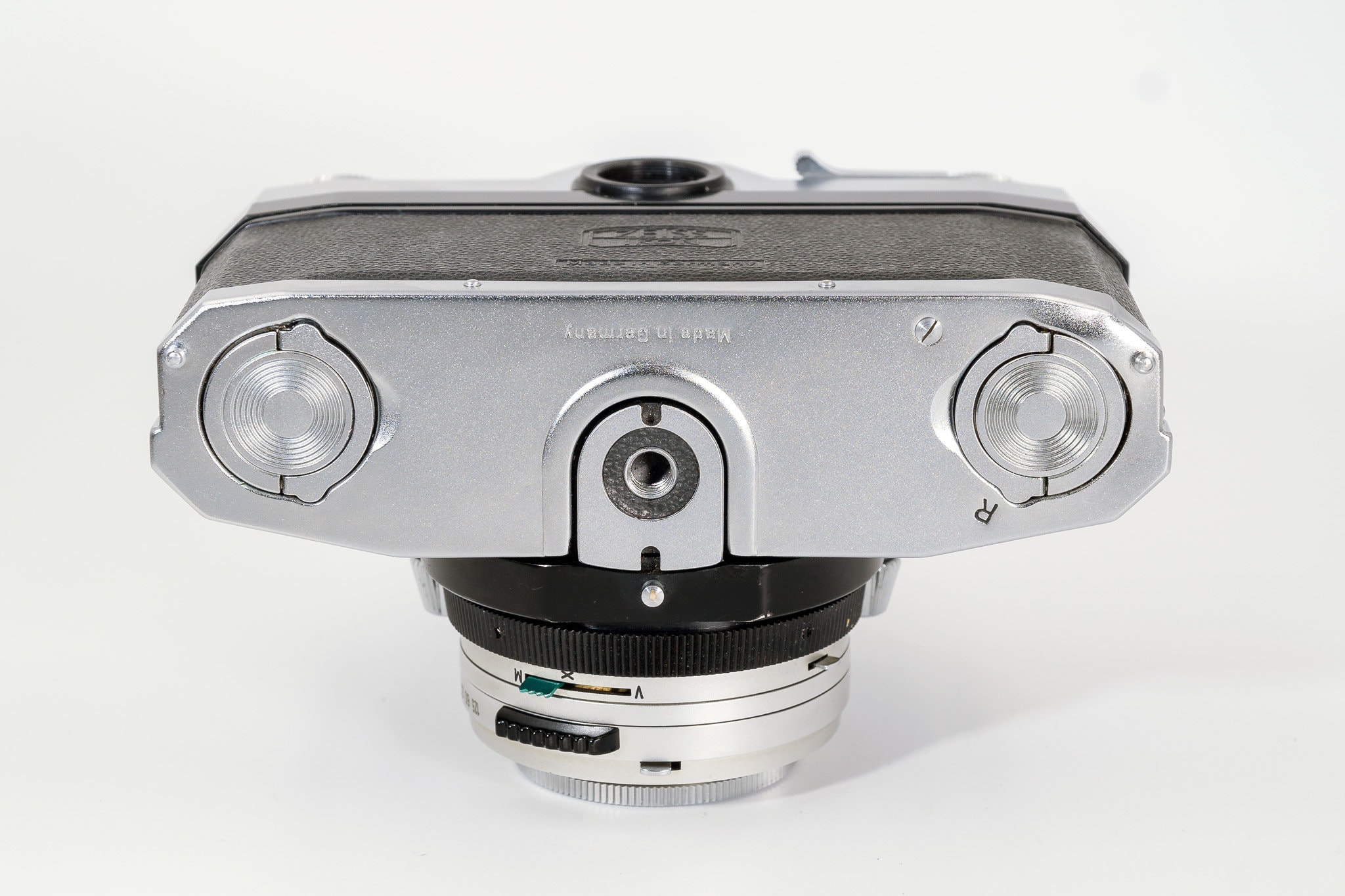 The Contaflex Super has a coupled selenium exposure meter on the front side of the prism. It is easily recognized by the aperture setting wheel on the front plate. The meter's match-needle instrument is visible in the finder as well as on the top plate from the outside. It has a special exposure setting conception. The speed setting ring has two grips to provide lever power for exposure setting which is needed since turning the speed ring automatically turns the aperture ring into the opposite direction. The thumb-wheel around the camera's film speed setting knob is the device to turn the aperture ring on the lens barrel independently and to change its relation to the speed ring so that other speed/aperture-combinations become possible. If this device is used for match-needle metering the speed ring with the grips allows to switch easily to other exposure-setting combinations without getting out of correct exposure values as shown by the meter.